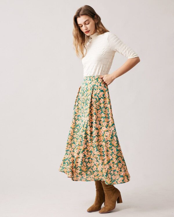 The High Waisted Pleated Floral Midi Skirt